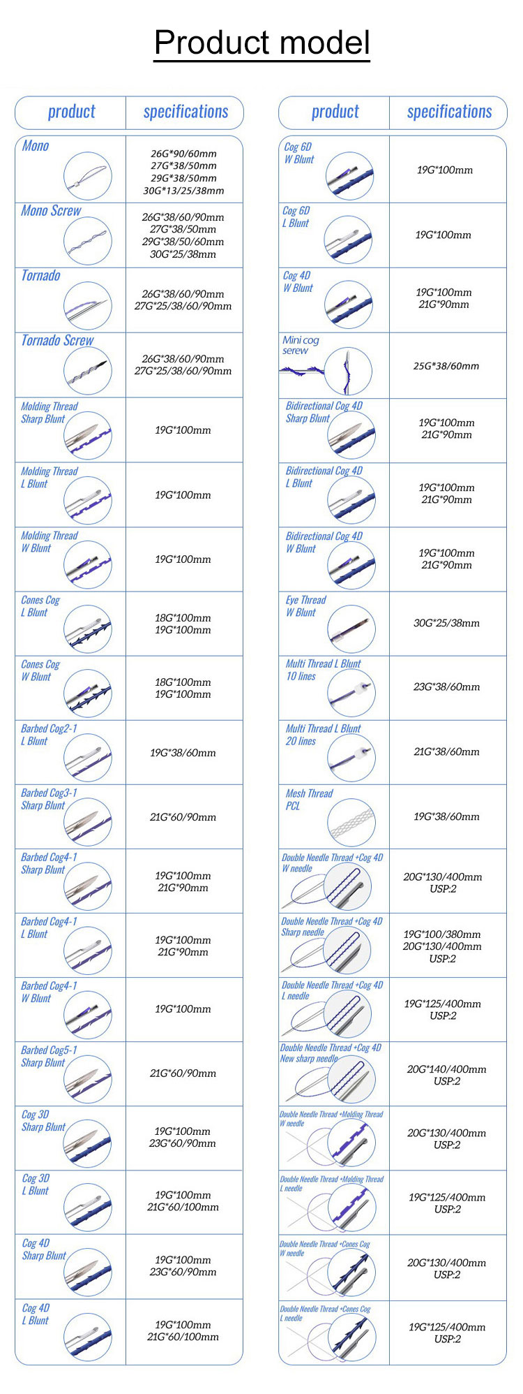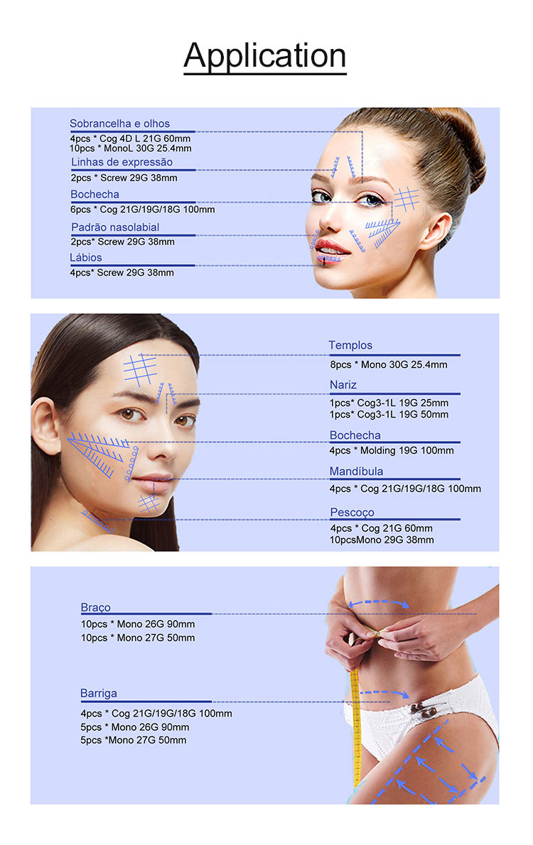 Тип: Резьба для литьевых зубцов Модель: Игла L 18G 100/120 мм, 19G 100/120 мм W Игла 18G 100 м, 19G 100 мм Острая игла: 19G 100 мм Применение: Лоб, глабелла, линия улыбки, обвисшая щека, шея, двойной подбородок, живот, грудь, бедро, теленок